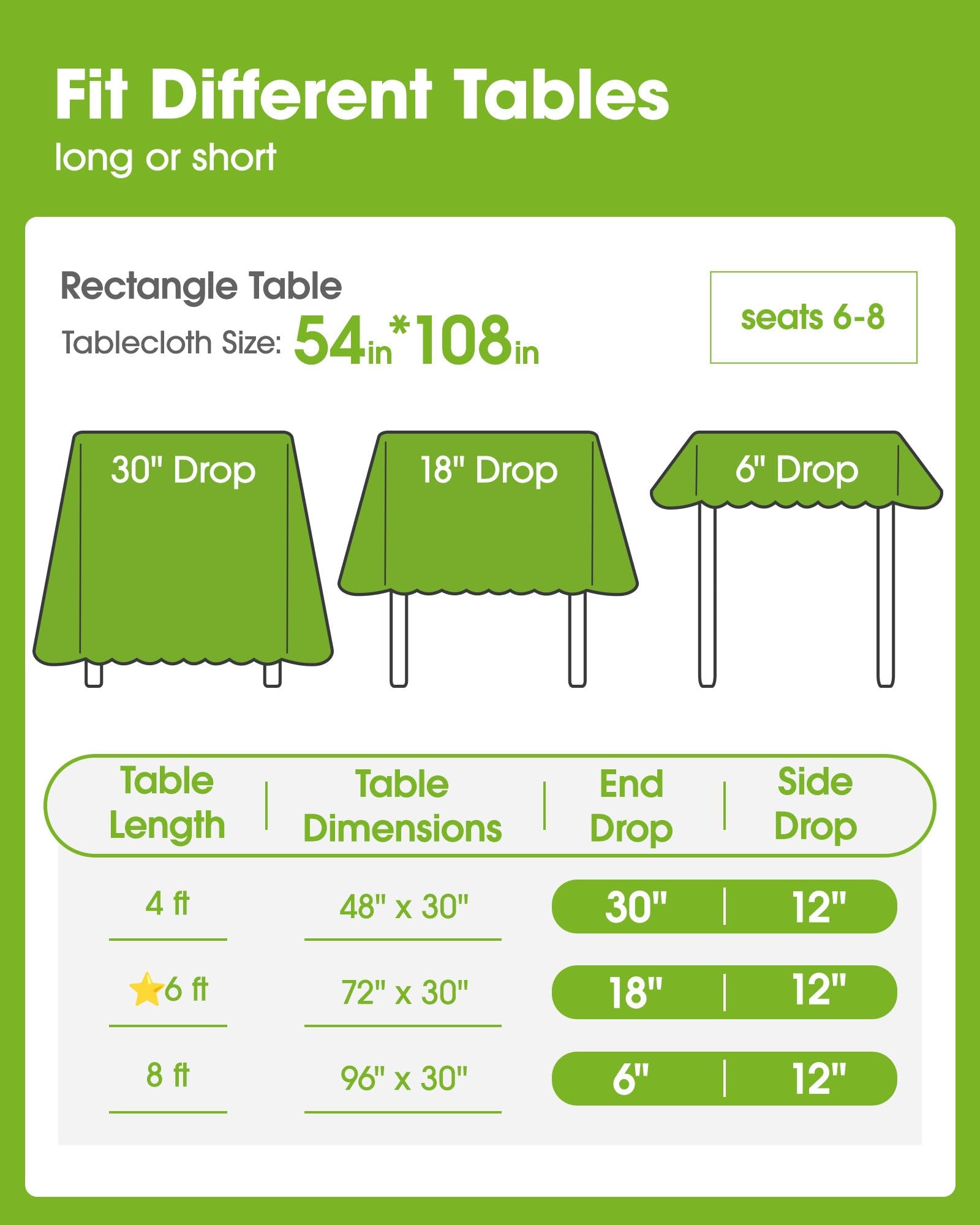 - FIT ANY SHAPE OF TABLES: Pureegg disposable tablecloths for rectangle tables measure 54" x 108" and fit tables up to 8 feet long. These plastic table cloths also fit smaller tables or various kinds of tables, like folding buffets, outdoor picnic, kitchen, and dining tables.